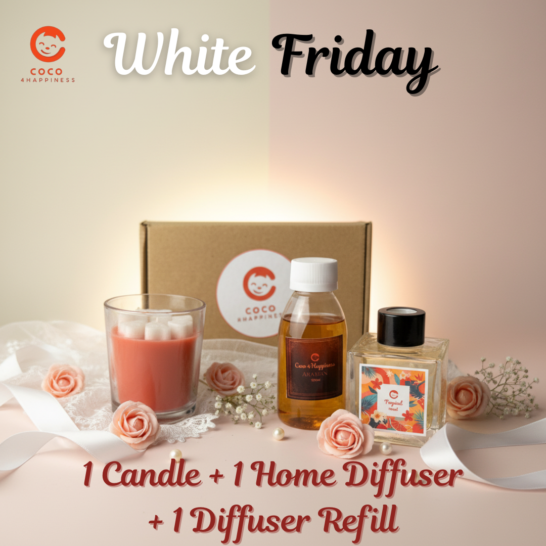 واحد شمعة + واحد فواحة منزلية + واحد زجاجة اعادة تعبئة